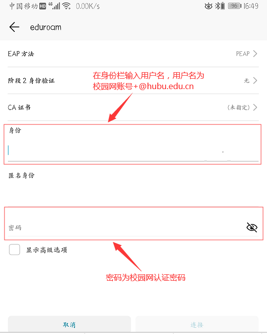我校师生在访问eduroam联盟的高校或学术组织时,用户名为:学号或工号+@hubu.edu.cn(认证时请务必添加“@hubu.edu.cn”后缀,否则将不能正常使用,例如:20040000@hubu.edu.cn)。密码为:校园网认证密码(请妥善保管,切勿外传)。