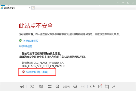 2、如浏览器提示“此站点不安全”,请选择继续访问。