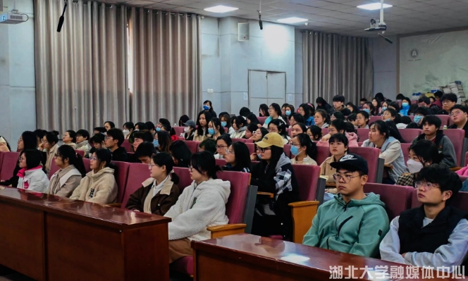 讲座开始前,同学们通过《大写湖北人》专题片,了解了董继宁从一名对艺术全然无知的知识青年到艺术大家再到传播艺术的领路人,立志“为祖国山河立传”的感人事迹。