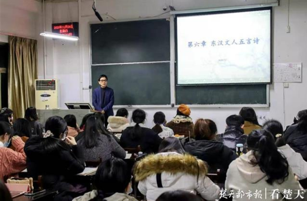 上课前,身着正装的何新文教授提前十分钟来到教室,在讲台上默默注视着他的“关门弟子”。晚上七点,《古代文学史》开始上课。课上,何新文讲解了“东汉文人五言诗”,并细细交代期末考试相关事宜,叮嘱学生不要过于看重成绩,多去享受学习的过程。“非常感谢同学们一学期的陪伴,我的‘电话热线’永远为你们接通。”讲完课,何新文站在讲台上,向学生鞠躬致谢。
