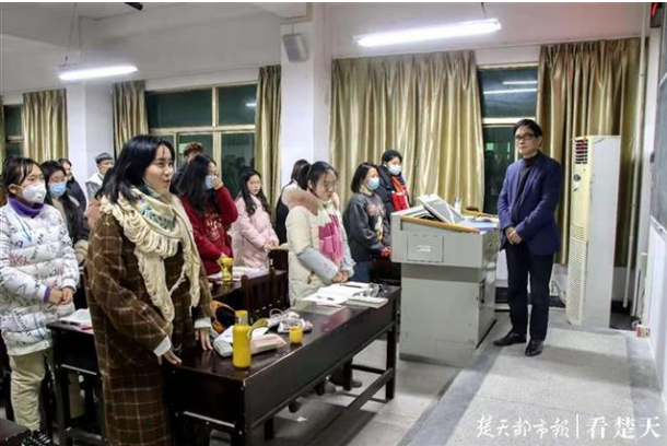 楚天都市报11月27日讯 “长亭外,古道边,芳草碧连天……”26日晚,湖北大学三号教学楼207教室传来阵阵歌声。负责巡查教室的学校保安不忍打扰,在门外驻足停留。教室内,2019级汉语言文学国家基地班的学生用一曲《送别》,为该校文学院教授何新文的“最后一课”划上句号。