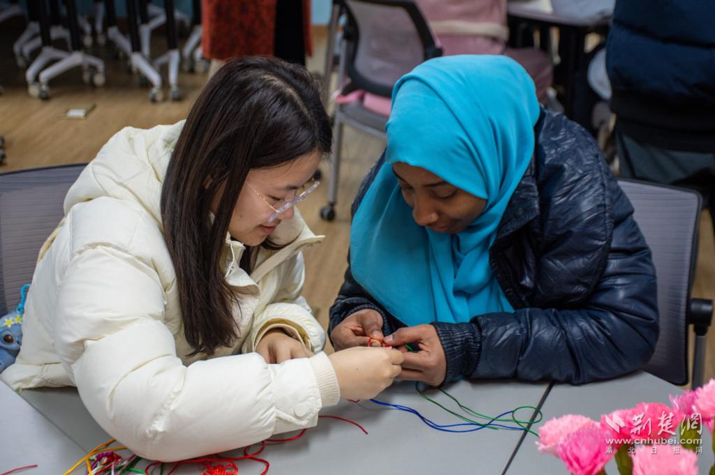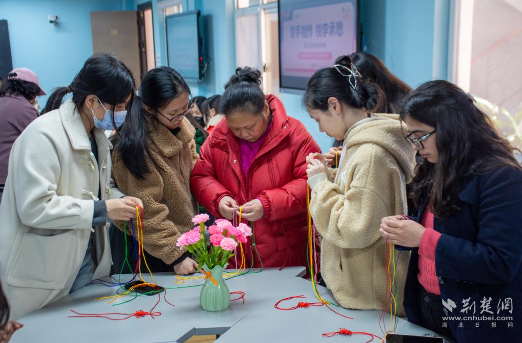 荆楚网(湖北日报网)讯(记者许文秀 通讯员李欢燃 马田羽 摄影郑川威)“从下面绕过来,转一个圈,把绿线穿到黄线里……”3月7日中午,一场热闹非凡的传统编织教学活动在湖北大学举行。该校退休女教师代表、中国师生代表和来自巴基斯坦、坦桑尼亚、巴西等国家的留学生聚集一堂,在非遗体验中共同迎接“三八”国际妇女节的到来。