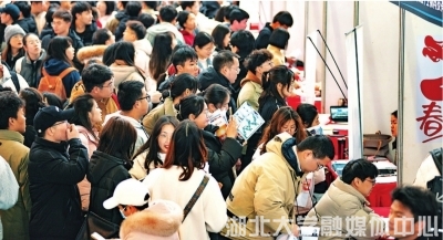 在湖北大学招聘会现场,中国通信建设、中国水利水电、中建七局、海亮教育科技服务集团等323家用人单位,覆盖制造业、建筑业、金融、公共服务、教育等行业领域,携7000多个岗位进校招揽人才。其中,很多企业都提供了管培生、实习生的岗位。