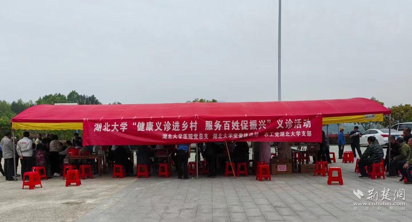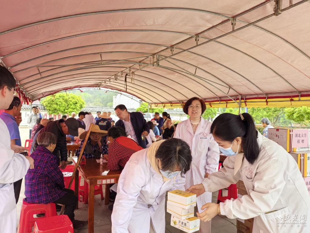 4月13日上午九点,在湖北大学医院党总支书记代汉文、院长曾祥英的带领下,20余位医务工作者来到湖北大学乡村振兴工作驻村点——英山县石头咀镇大屋冲村开展送医送药大型义诊活动。