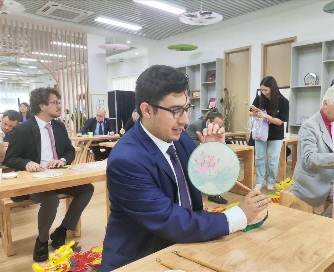 一走进湖北大学曼城联合学院,考察团的成员们就被由湖北大学的学生们带来的舞龙舞狮表演吸引,纷纷拿出手机拍摄留念。在湖北大学曼城联合学院的中国文化体验中心,考察团成员们饶有兴致地体验了手绘宫扇绢画,并与湖北大学商学院、公共管理学院和马克思主义学院的专家学者,聚焦中国式现代化湖北实践、发展新质生产力等主题展开交流探讨。