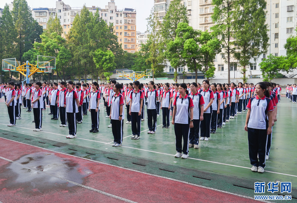 图为湖北大学附属中学学生在操场聆听国旗下的讲话。新华网发 潘锡东摄