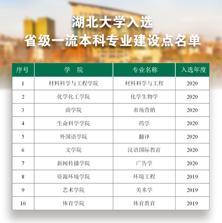 近日,根据《教育部办公厅关于公布2020年国家级和省级一流本科专业建设点名单的通知》(教高厅函〔2021〕7号),湖北大学9个专业获批2020年度国家级一流本科专业建设点,7个专业获批2020年度湖北省一流本科专业建设点。目前,我校获国家级一流本科专业建设点26个,省级一流本科专业建设点10个,国家级一流本科专业建设点总数在省属高校排名第一。