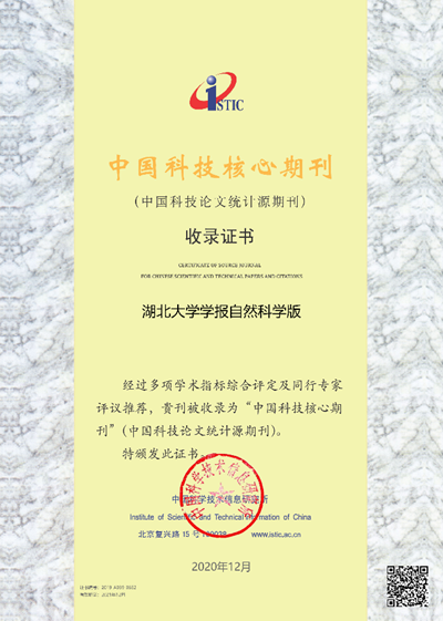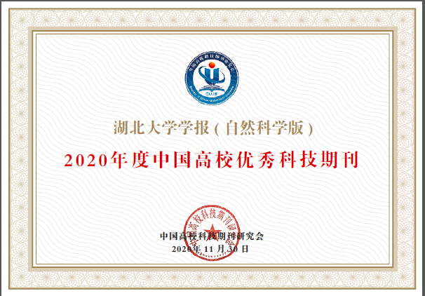 在中国高校科技期刊研究会评优活动中,《湖北大学学报》(自然科学版)获得“2020年度中国高校优秀科技期刊”荣誉称号。此外,《湖北大学学报》(自然科学版)同时入围中国科学技术信息研究所发布的《2020年中国科技论文(核心)统计源期刊》(科技部委托的科技智库分析系统之一)和2020版武汉大学RCCSE中国学术核心期刊(A等级)。