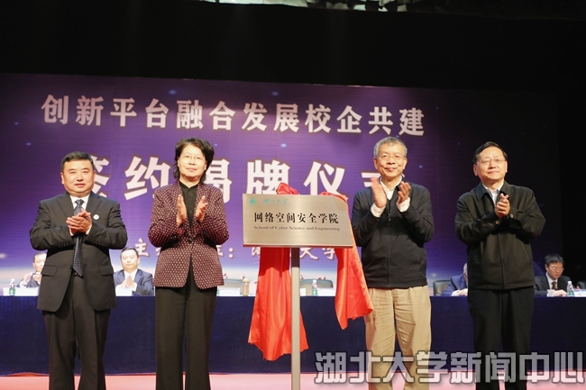 湖北省人民政府副省长肖菊华,中国工程院院士吴汉明,湖北省委教育工委专职副书记、湖北省教育厅党组成员孔祥恩,湖北大学校长刘建平为湖北大学网络空间安全学院揭牌。