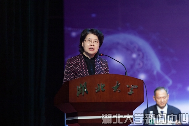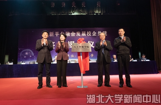 湖北省人民政府副省长肖菊华,湖北省委网信办副主任李耀华,湖北省经济和信息化厅党组成员、总工程师盛章学,湖北大学党委书记谢红星为湖北大学人工智能学院揭牌。