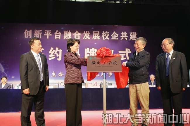 湖北省人民政府副省长肖菊华,中国工程院院士吴汉明,湖北省人民政府副秘书长卢军,湖北大学党委书记谢红星为湖北大学微电子学院揭牌。