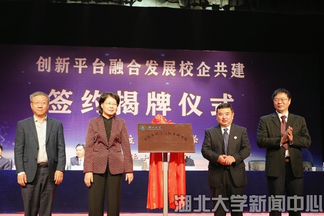 湖北省人民政府副省长肖菊华、省科技厅副厅长杜耘、武汉市科技局副局长徐涛、湖北大学校长刘建平为湖北大学新能源科学技术研究院揭牌。