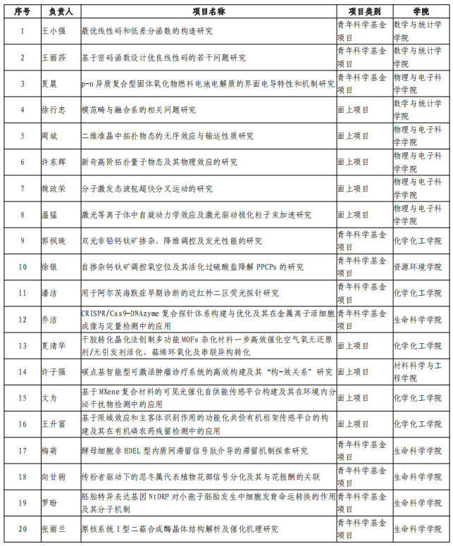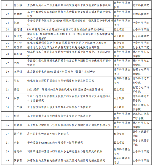 按项目类型,我校获批面上项目18项、青年科学基金项目22项;按科学部,获批项目分布在六个科学部,其中生命科学部11项、数理科学部8项、化学科学部8项、工程与材料科科学部7项、信息科学部4项、医学科学部部2项;按学院,生命科学学院11项、材料科学与工程学院7项、物理与电子科学学院7项、化学化工学院6项、数学与统计学学院5项、资源环境学院3项、计算机与信息工程学院1项。