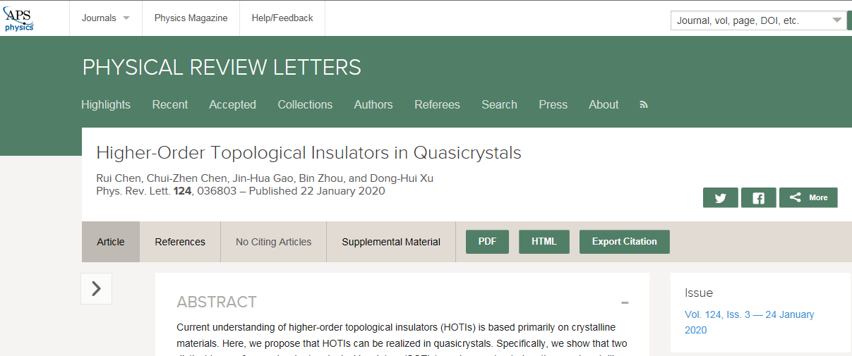 近日,物理学顶级期刊《物理评论快报》(Physical Review Letters)发表了我校物理与电子科学学院许东辉副教授、周斌教授关于高阶拓扑绝缘体的重要原创工作,题目为 “Higher-Order Topological Insulators in Quasicrystals”(准晶中的高阶拓扑绝缘体),湖北大学为论文第一和通讯单位,苏州大学、华中科技大学为合作研究单位。周斌教授的博士生陈锐(现为南方科技大学博士后)为论文第一作者,许东辉副教授、周斌教授为论文共同通讯作者。本工作得到国家自然科学基金、楚天学者“楚天学子”计划的支持。