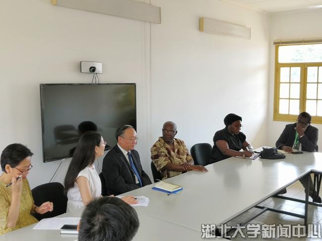 当地时间7月9日傍晚刚一抵达圣普,谢红星一行就拜访了中国驻圣普大使王卫。谢红星向王卫大使介绍了学校及孔子学院开办的情况,向中国驻圣普大使馆长期以来对湖北大学的关心与支持表示感谢。王卫对湖北大学师生来访表示欢迎,他说随着中圣普复交和交流的进一步深入,对汉语学习感兴趣的圣普人越来越多,湖北大学在圣普开办孔子学院意义重大。希望湖北大学多组织中圣普文化教育交流活动,祝愿湖北大学的孔子学院越办越好。