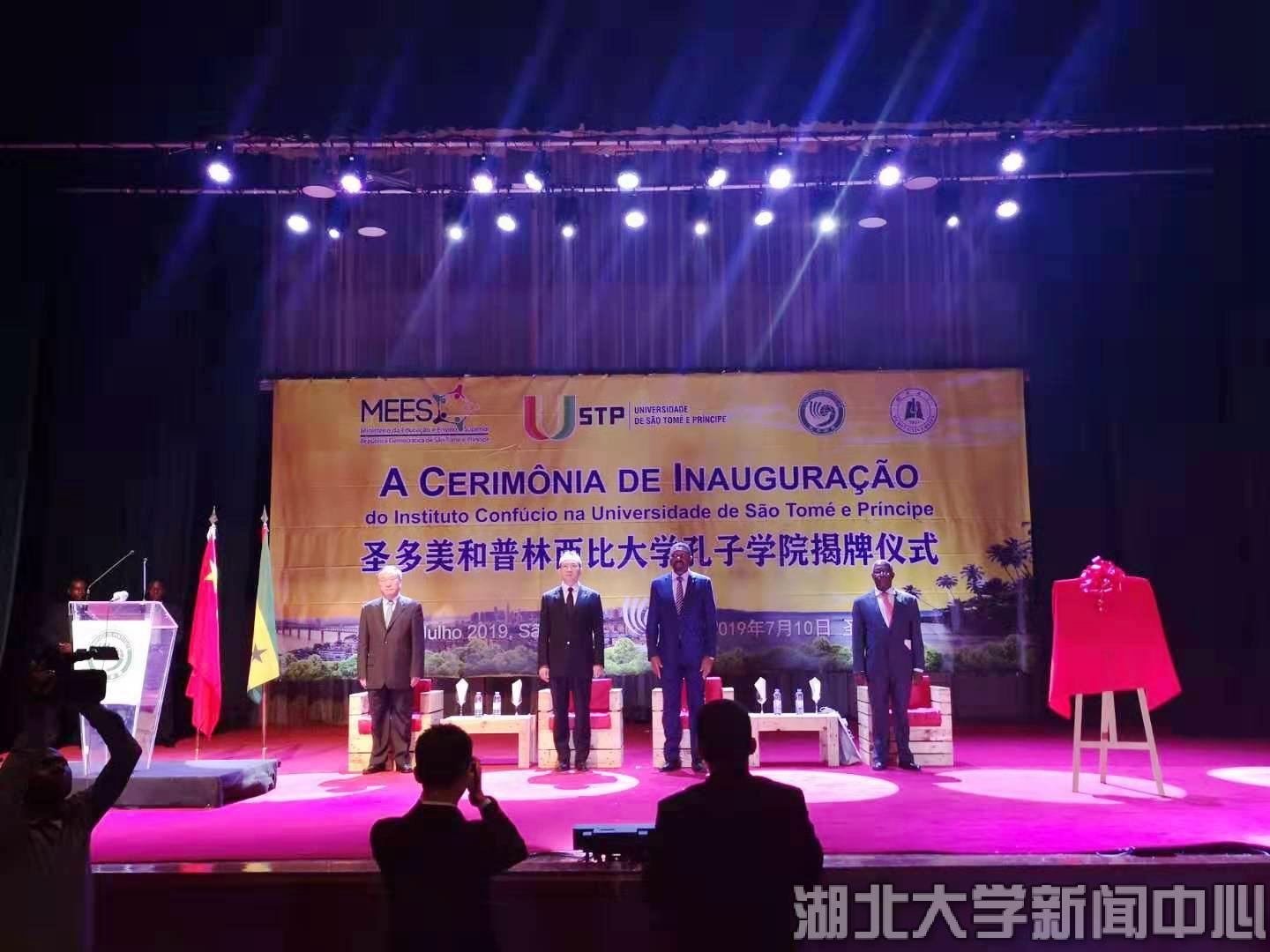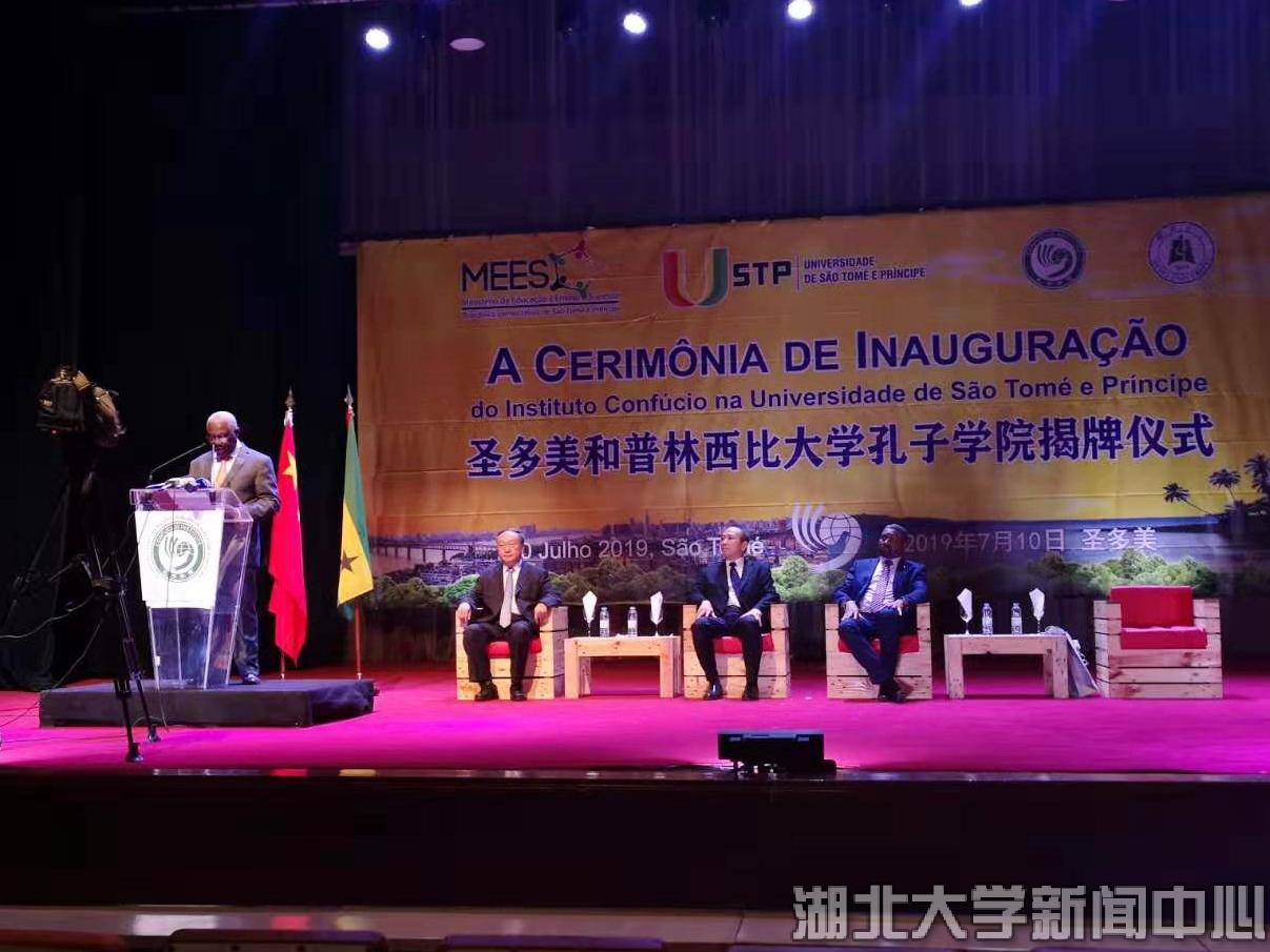 当地时间7月10日下午,湖北大学在非洲首家孔子学院揭牌仪式在圣多美和普林西比民主共和国(简称圣普)议会大厦隆重举行。圣普总理热苏斯、中国驻圣普大使王卫、湖北大学校长谢红星、圣普大学校长科斯塔共同为圣普大学孔子学院揭牌。圣普教育和高等教育部长罗德里格斯、文化和旅游部长拉夫雷斯、青年和创业部长德皮纳、孔子学院中方院长李祥坤、孔子学院外方院长安德烈,中国援圣普代表、中资机构代表,相关驻圣普外交人员、主要媒体,湖北大学师生及圣普大学师生共900余人出席揭牌仪式。