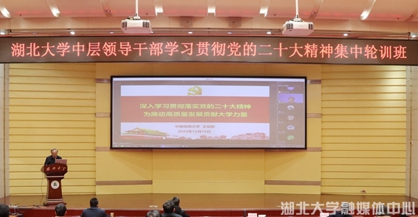 12月16日,湖北大学中层领导干部学习贯彻党的二十大精神集中轮训班第五次专题学习活动通过线上线下结合方式举行,湖北省委宣讲团成员、中国科学院院士、中国地质大学(武汉)校长王焰新作了题为《深入学习贯彻落实党的二十大精神 携手为推动高质量发展贡献大学力量》的辅导报告。校党委书记谢红星主持会议。